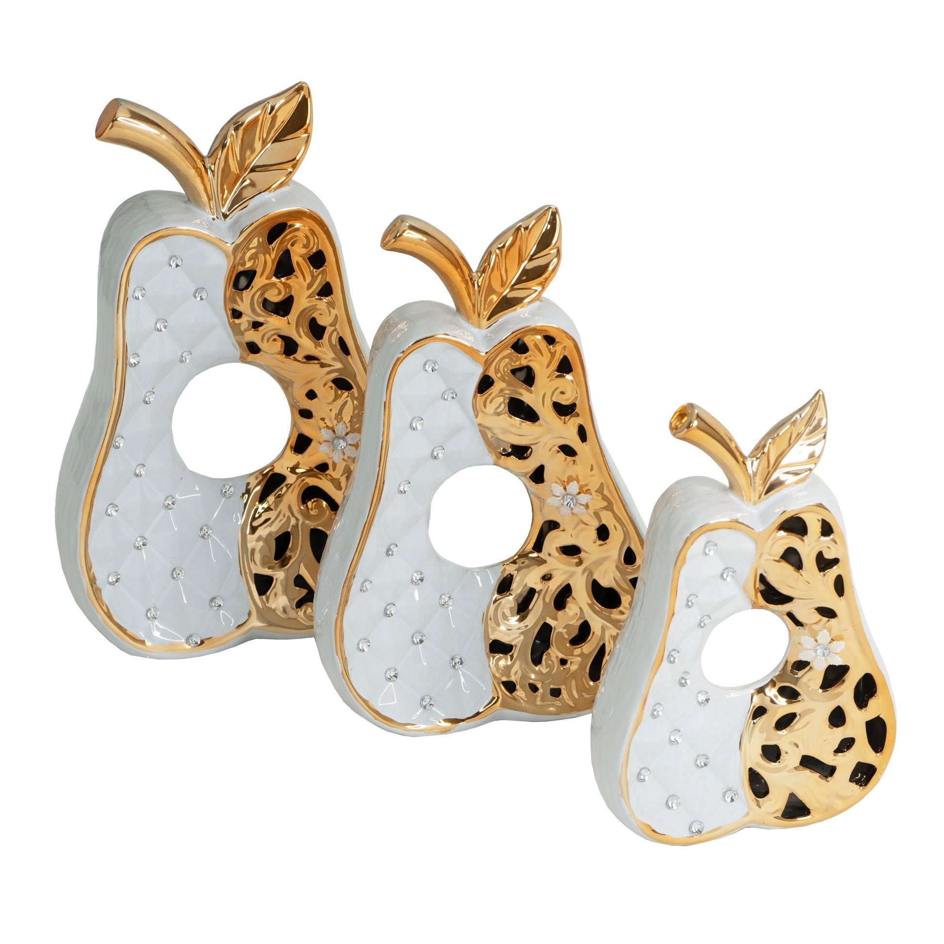 This abstract pear sculpture is the art piece needed to make your home feel vibrant. This three piece pear set can be placed individually or as a unit. Place in any dining table or kitchen. Crafted from fine quality polystone material with a silver, gold or red finish with beautiful detailing.