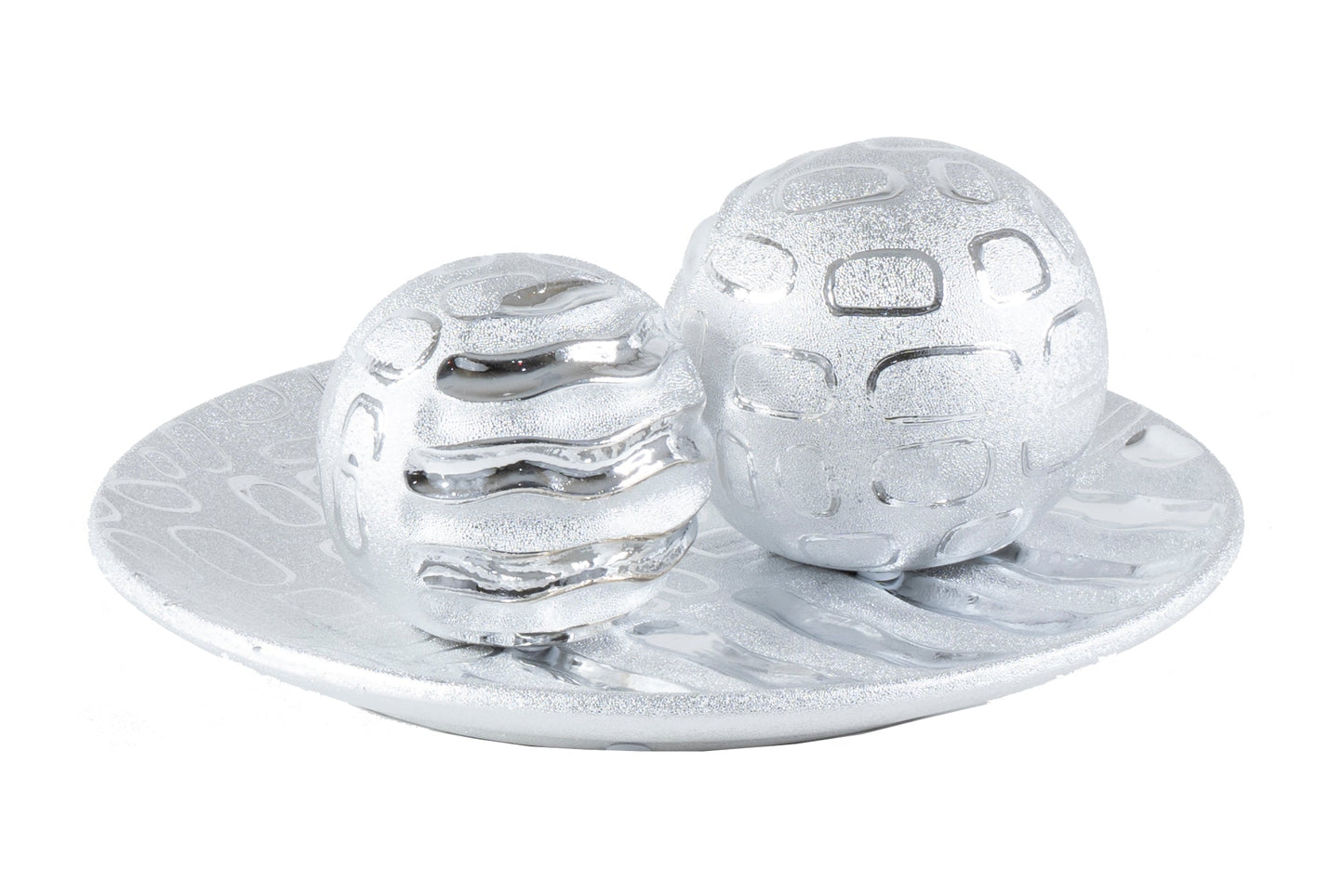 This breathtaking centerpiece is a must have decorative piece for your home. The stunning curved lines on the spheres will be perfect on your dinning or center table. This silver modern centerpiece is crafted from fine quality ceramic material with a silver finish.