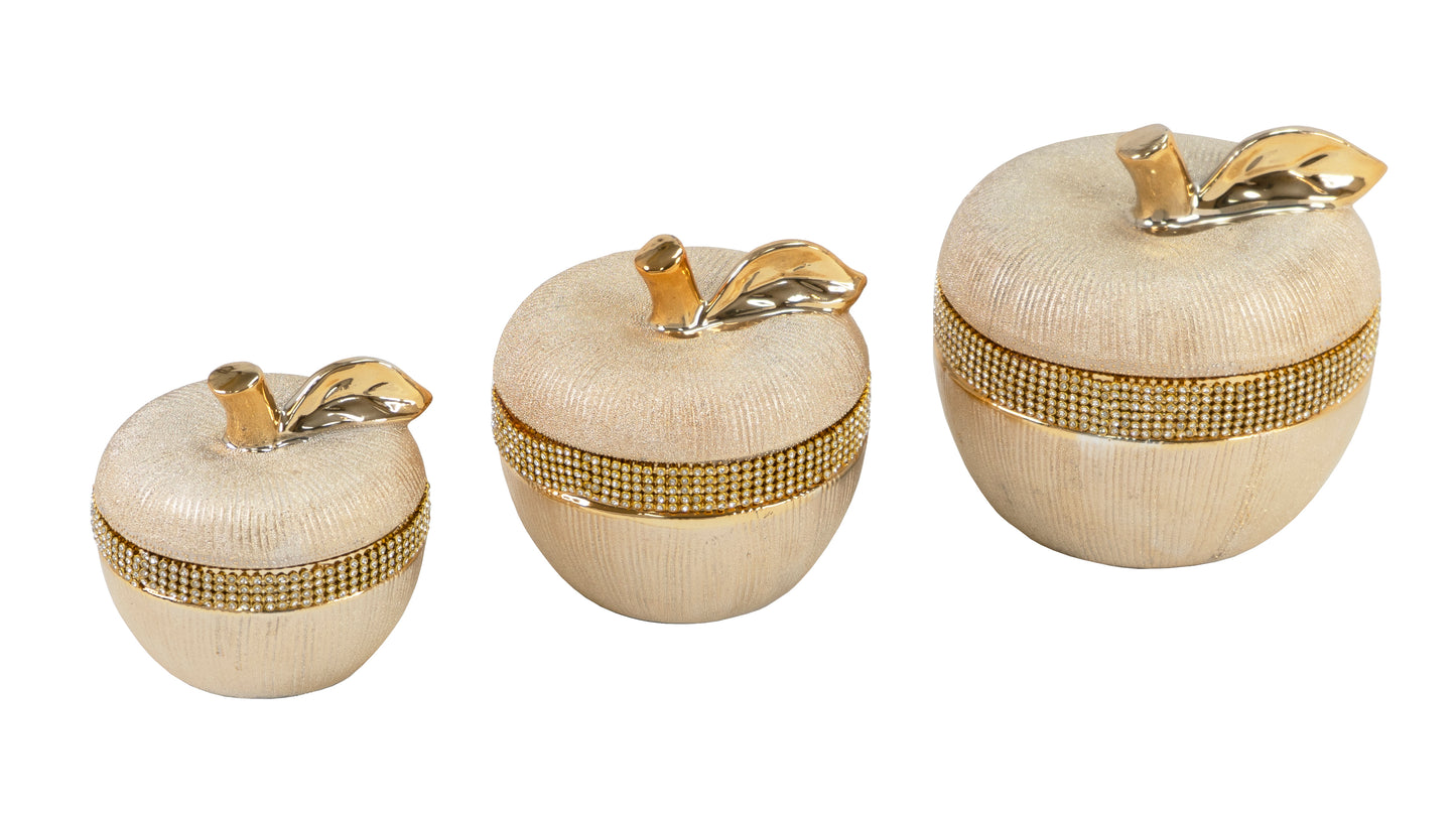 This refreshing four piece modern apple set is a lustrous table accent. The classic silver or gold tones will mesh perfectly with elegance in any dining room table. This 3 piece apple set is placed on an stunning detailed plate. Crafted from fine quality polystone material in a gold or silver finish.