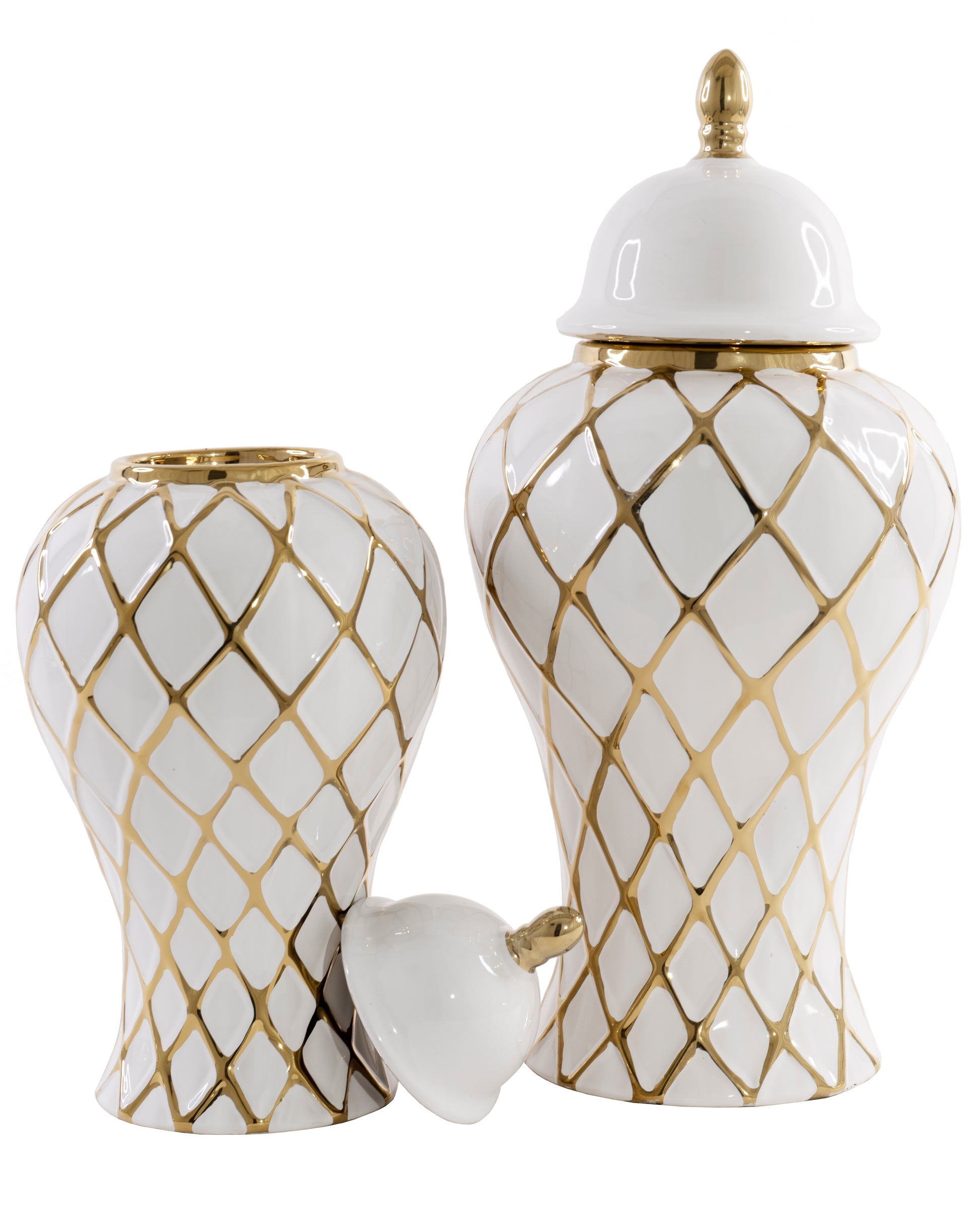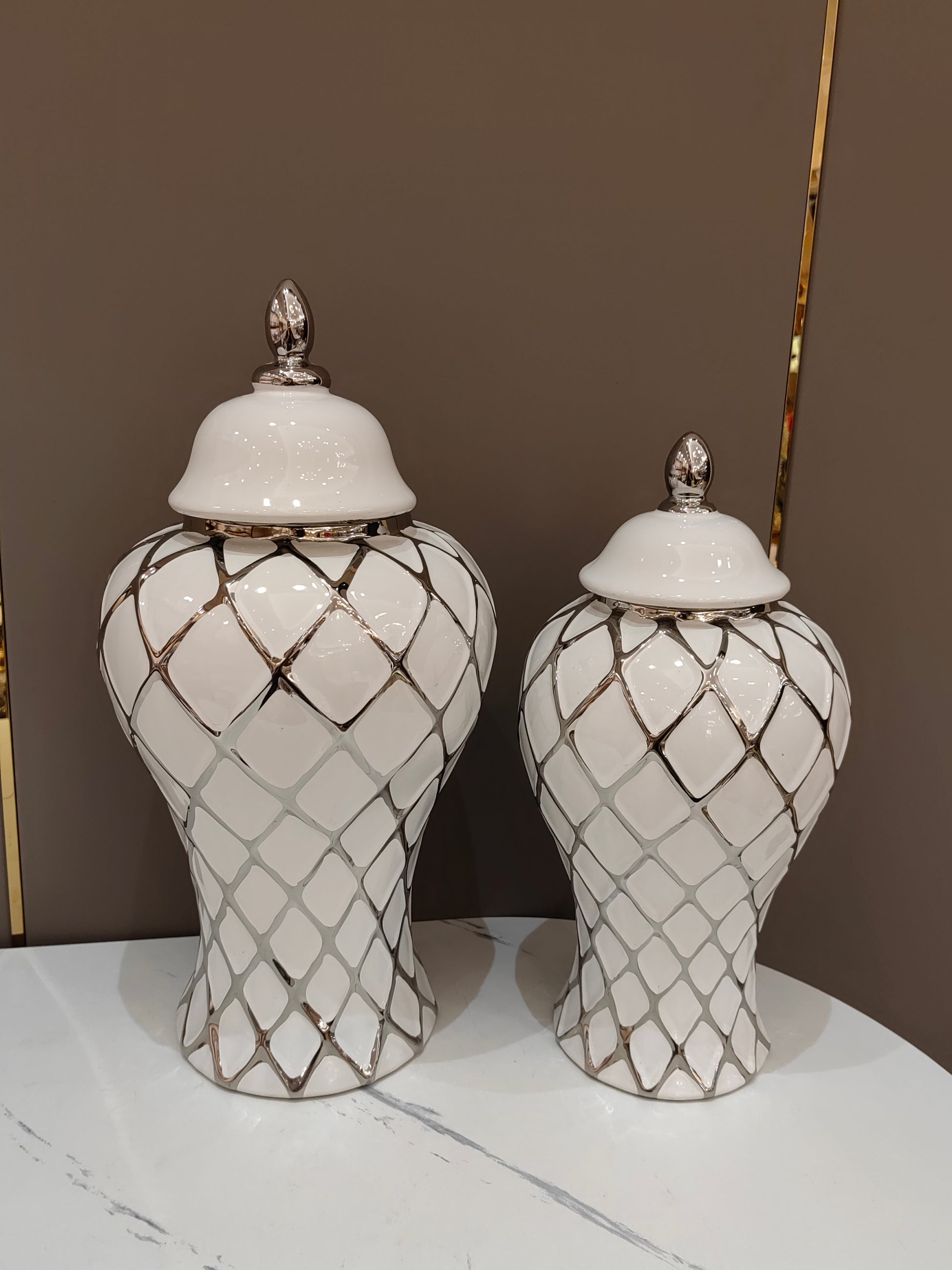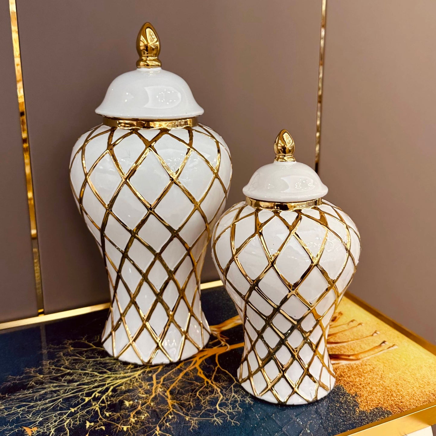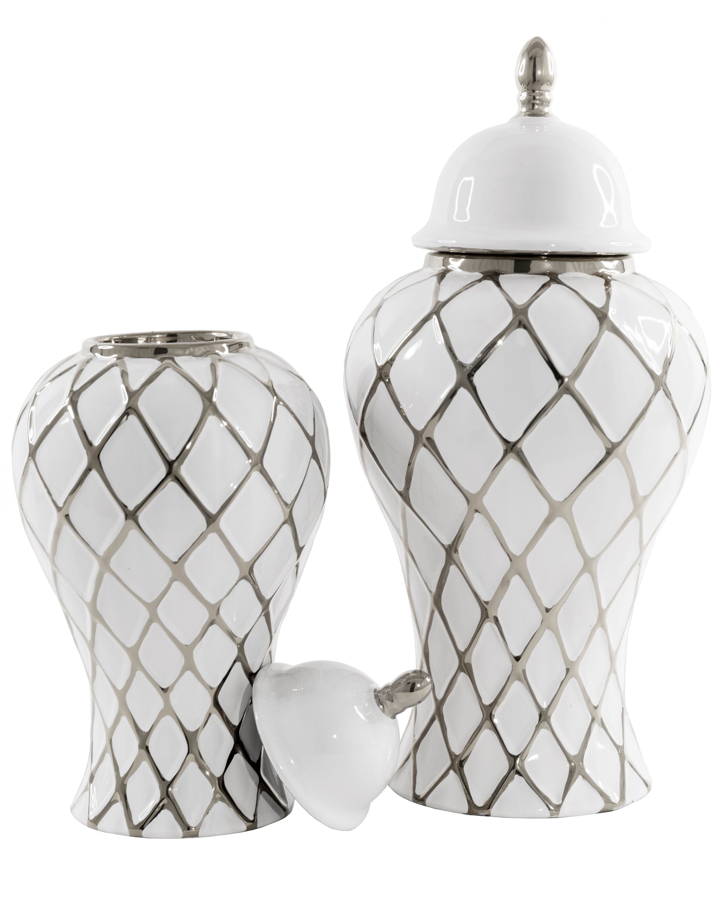 Add a touch of elegance to your home decor with our Decorative Ginger Jar Urn. Featuring a stunning cross hatch design, this jar is available in both silver and gold. Elevate any space with this beautiful and versatile piece.