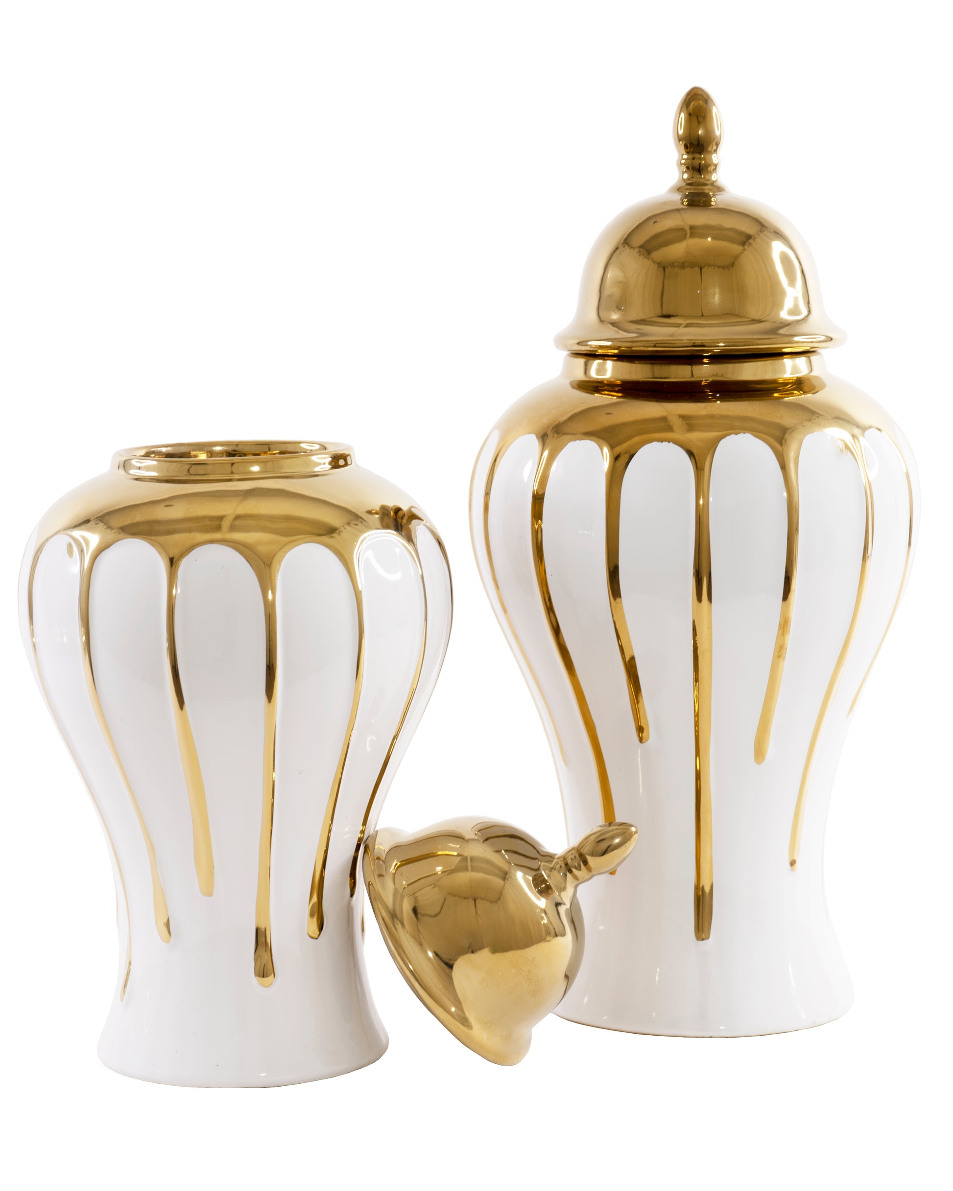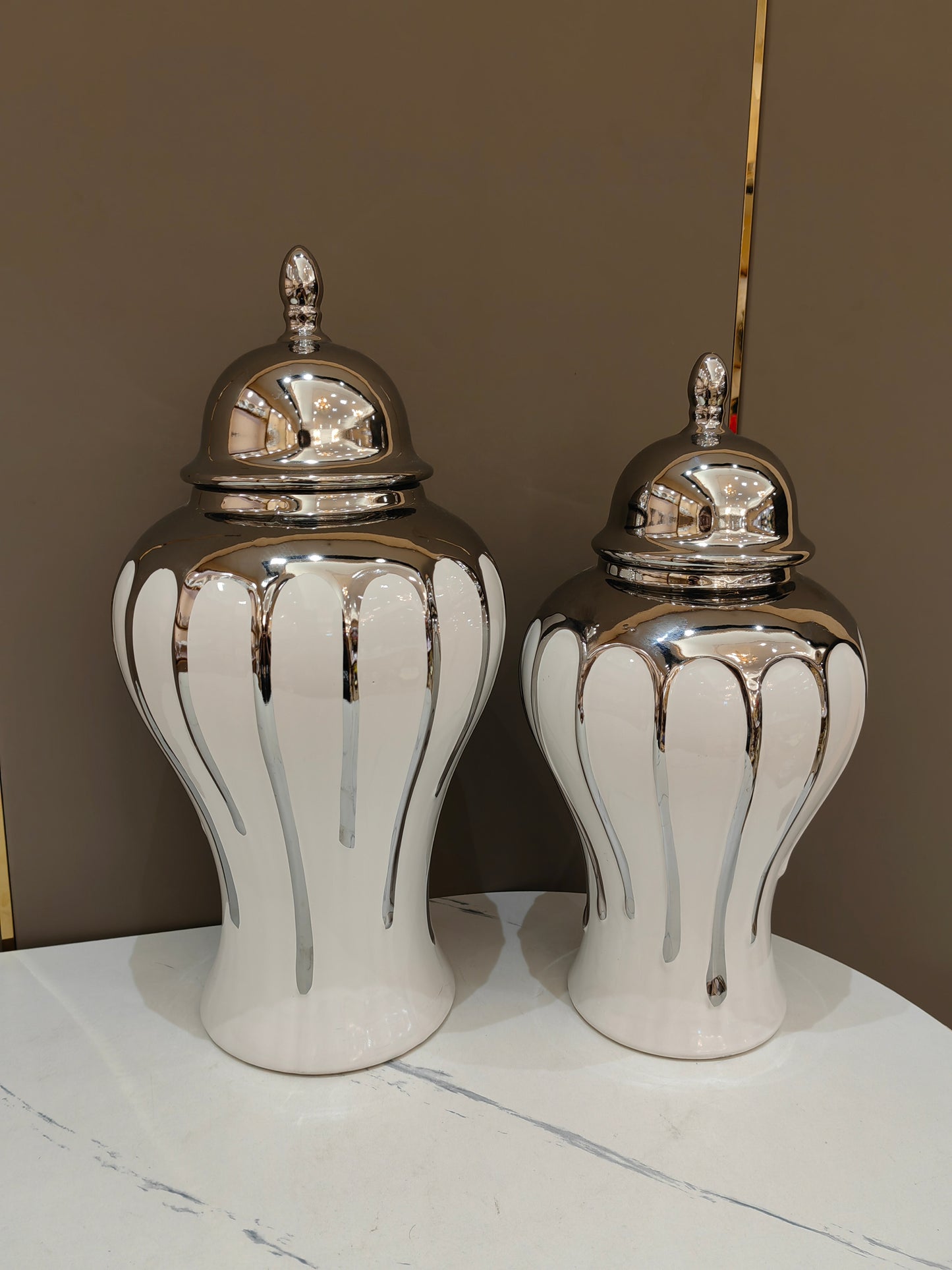 Elevate your decor with our Decorative Ginger Jar Urn. This modern piece boasts a unique "dripping" design and comes in silver or gold. With a tall build and a lid, it not only adds style, but also offers functionality. Transform any space with this elegant urn.