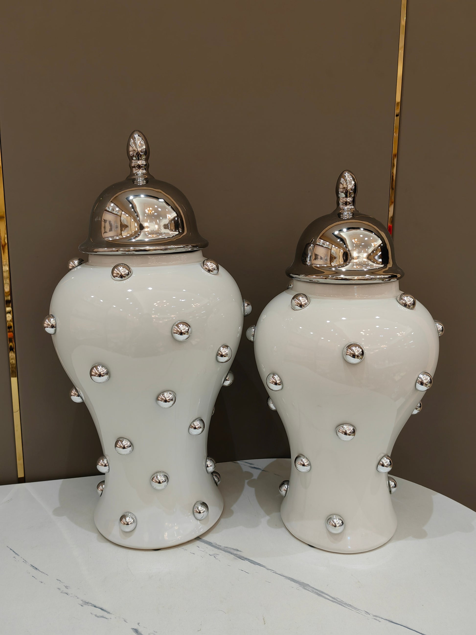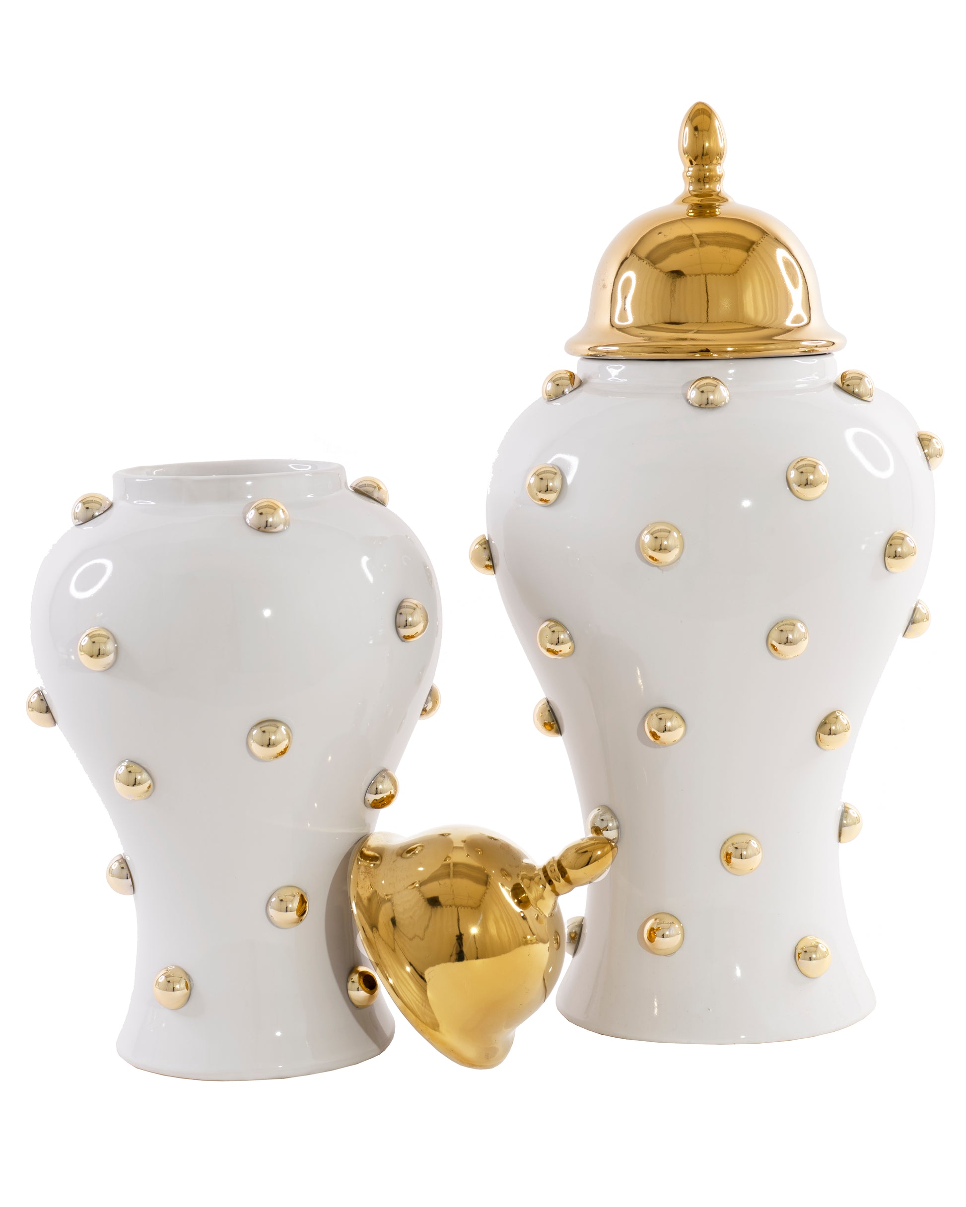 This decorative ginger jar vase is the perfect addition to any home decor. Featuring delicate dot accents, it adds a trendy touch of elegance to any room. Available in both gold and silver -it offers versatility and style to your space. Make a statement with this stunning vase.