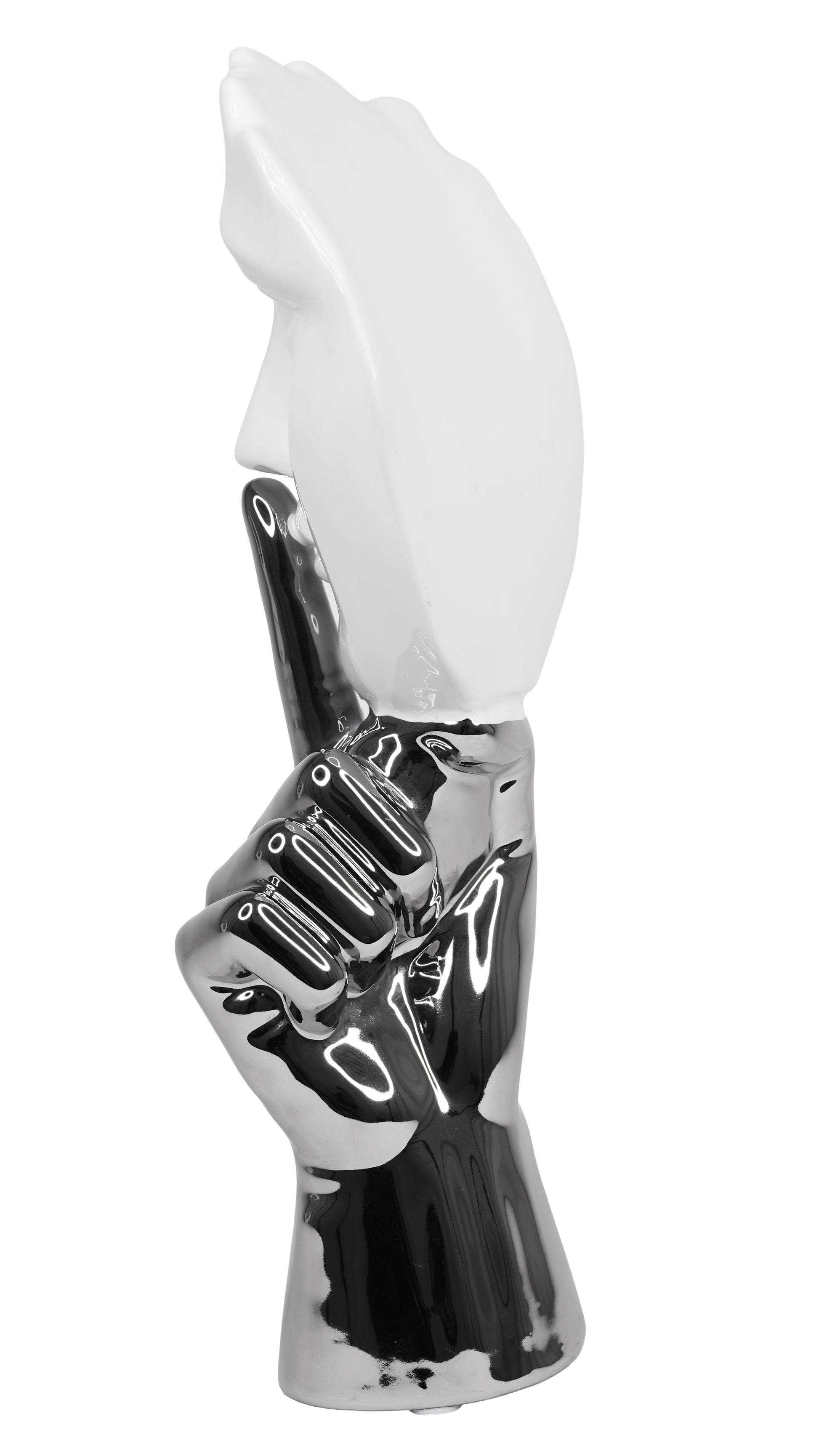 Make a bold artistic statement with this striking Silent Abstract Face Sculpture. Featuring a minimalist white face with a silver hand raised in a universal gesture of silence, this contemporary piece combines clean lines and sophisticated metallic accents. The floating design creates an intriguing sense of movement and depth, perfect for modern interiors seeking thought-provoking décor.