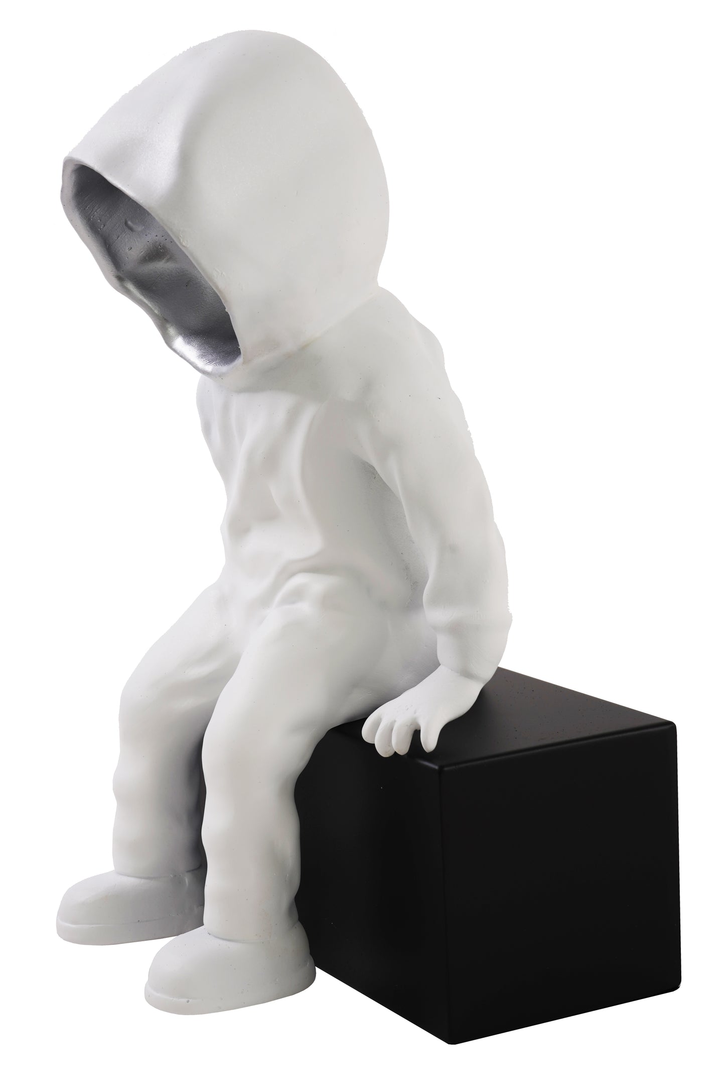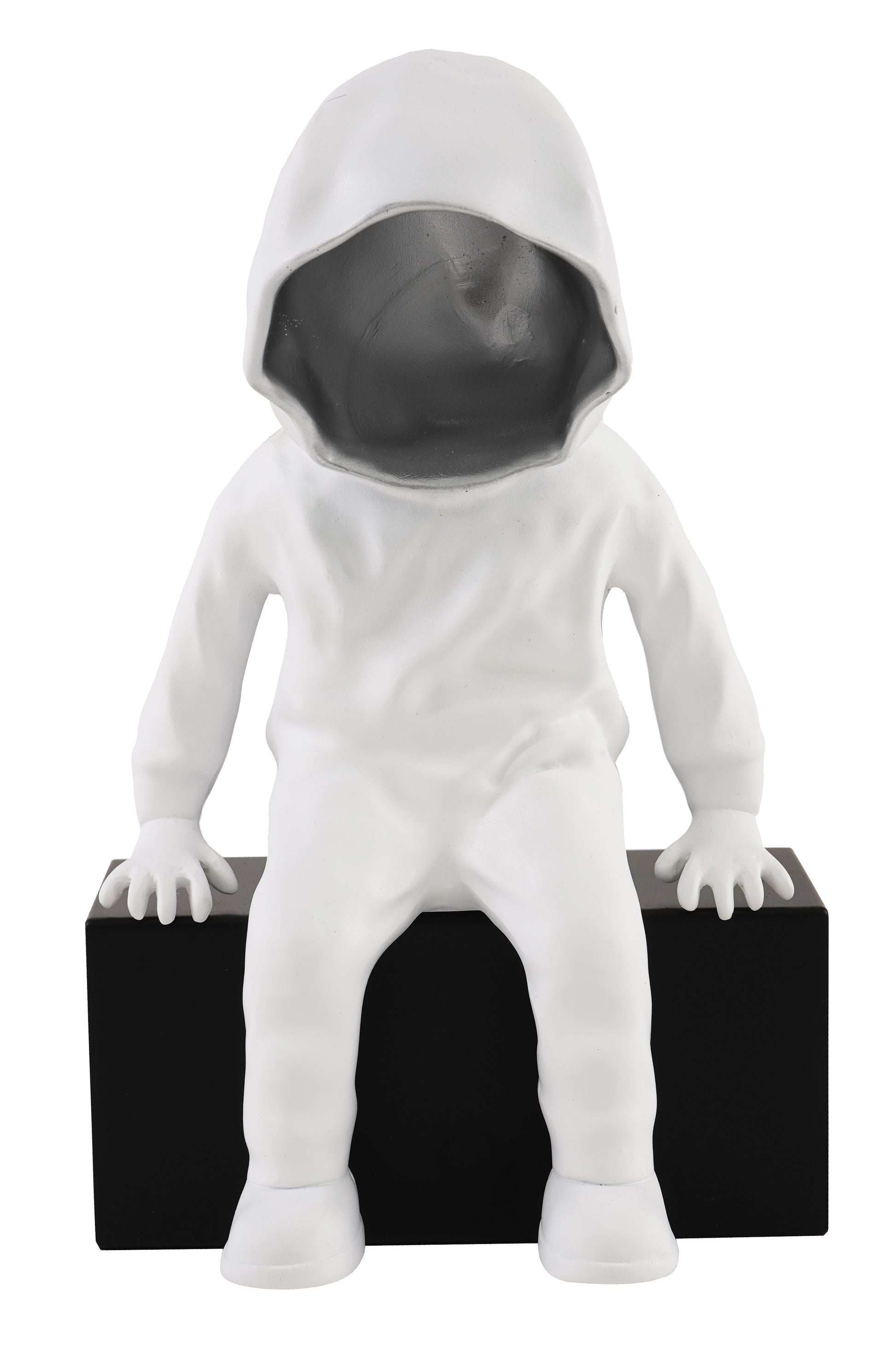 Introduce an artistic touch to your space with our Sitting Hoodie Man Sculpture. This statement piece features a mysterious hooded figure, with a silver interior - adding a unique and creative element to your decor. Expertly crafted, this sculpture is a must-have for any space enthusiast.